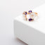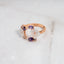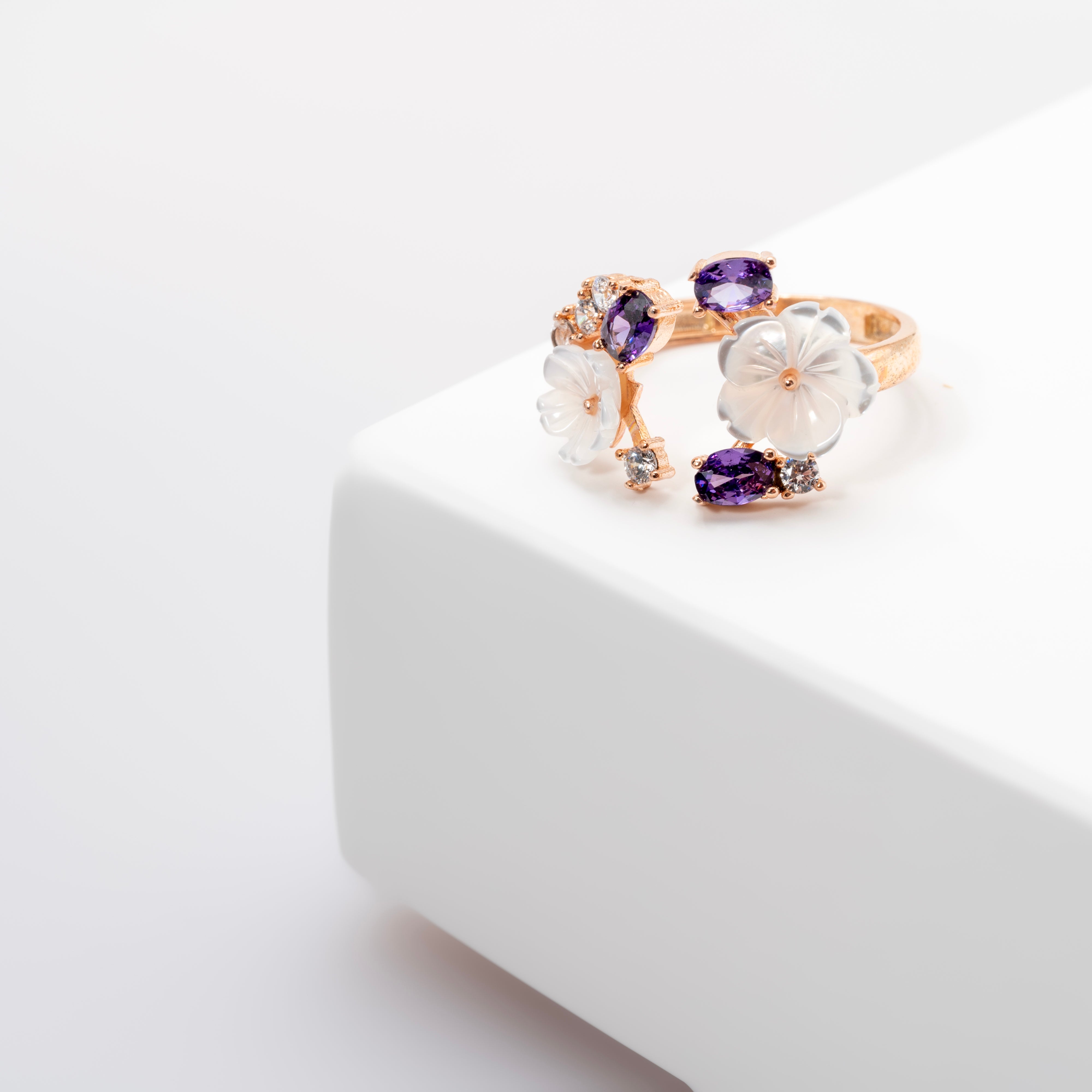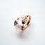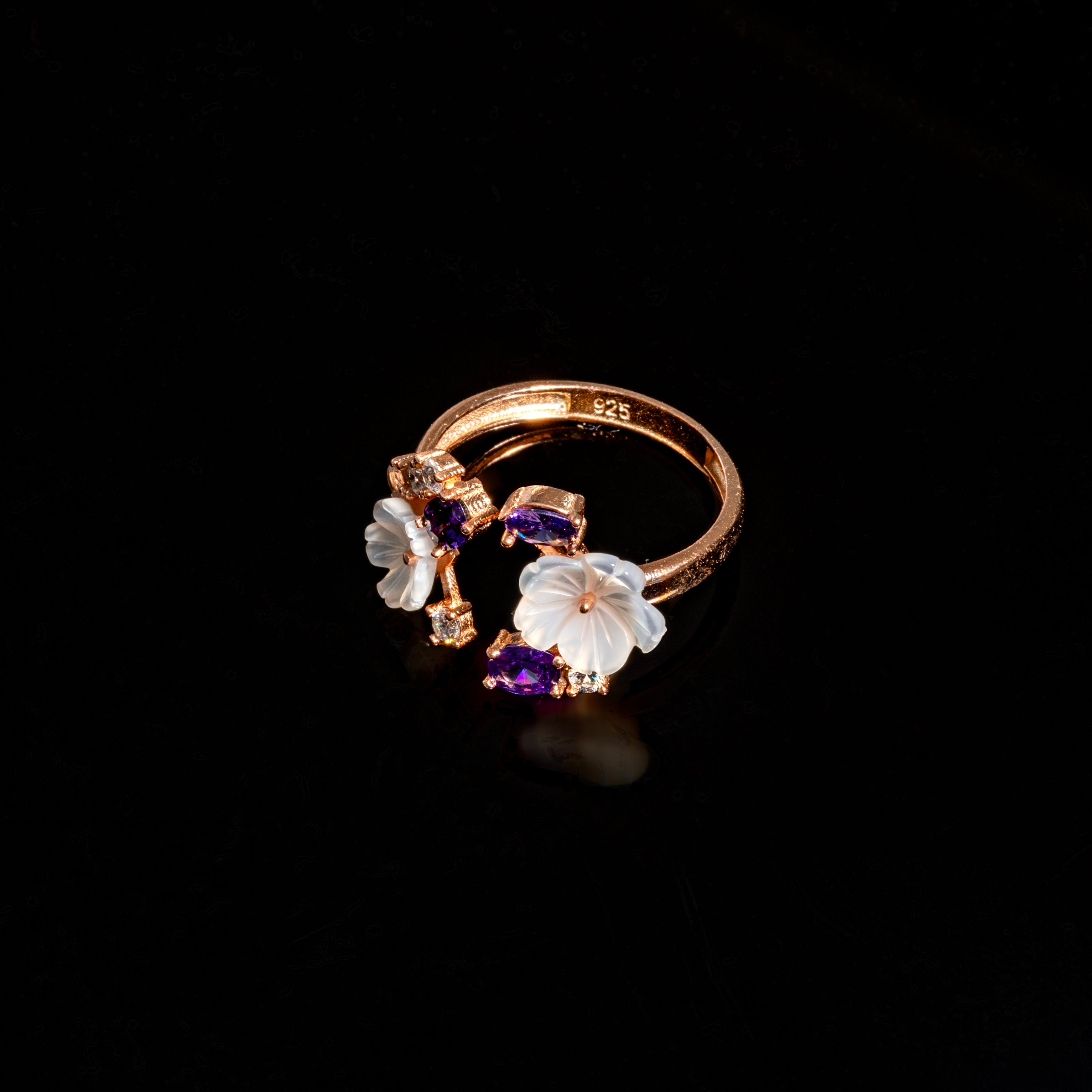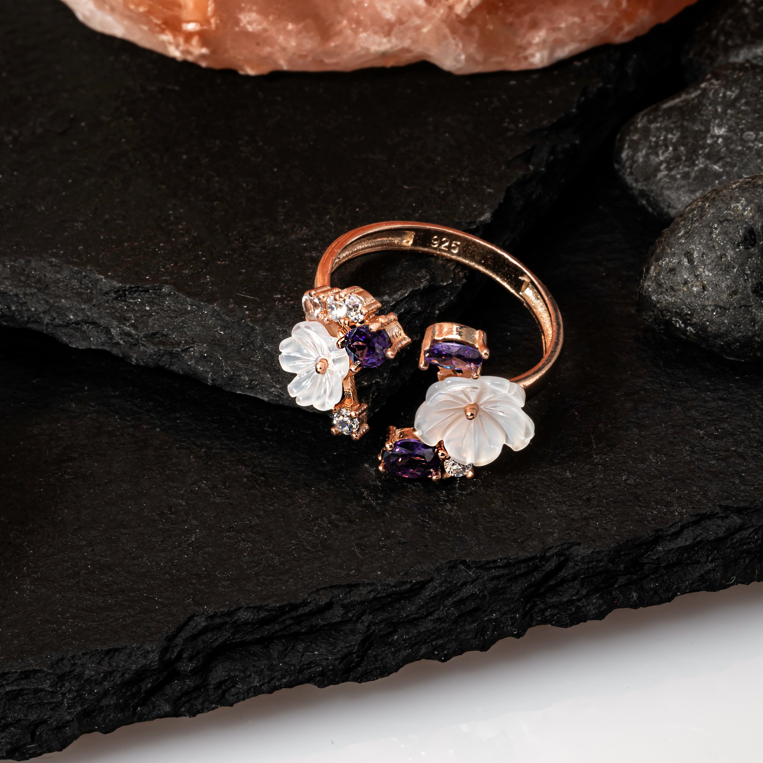 Cette bague ajustable en argent rosé présente un design magnolia unique et spécifique, ornée d'améthystes synthétiques scintillantes. La bague est fabriquée en argent de haute qualité et finie avec un revêtement en or rose. Grâce à sa taille ajustable, la bague peut convenir à n'importe quel doigt. Le design magnolia unique et les améthystes synthétiques confèrent à la bague une allure remarquable et élégante. L'améthyste synthétique est une pierre cultivée qui présente une couleur pourpre intense. Cette bague est parfaite pour une occasion spéciale ou comme ajout unique à votre collection de bijoux.