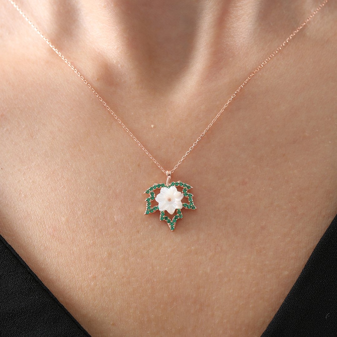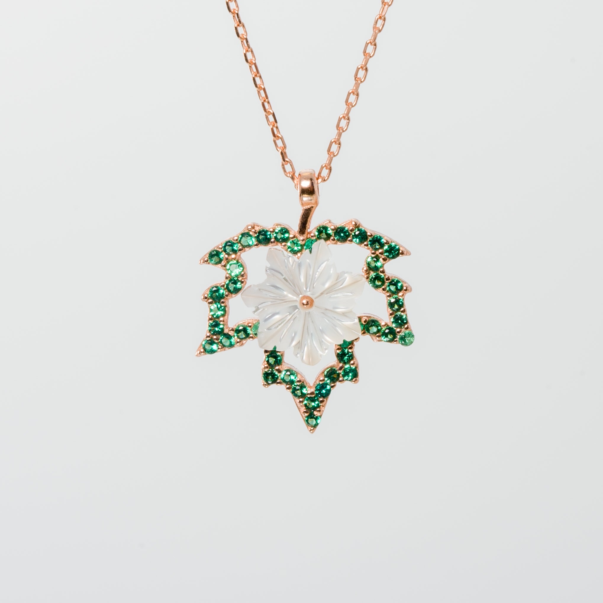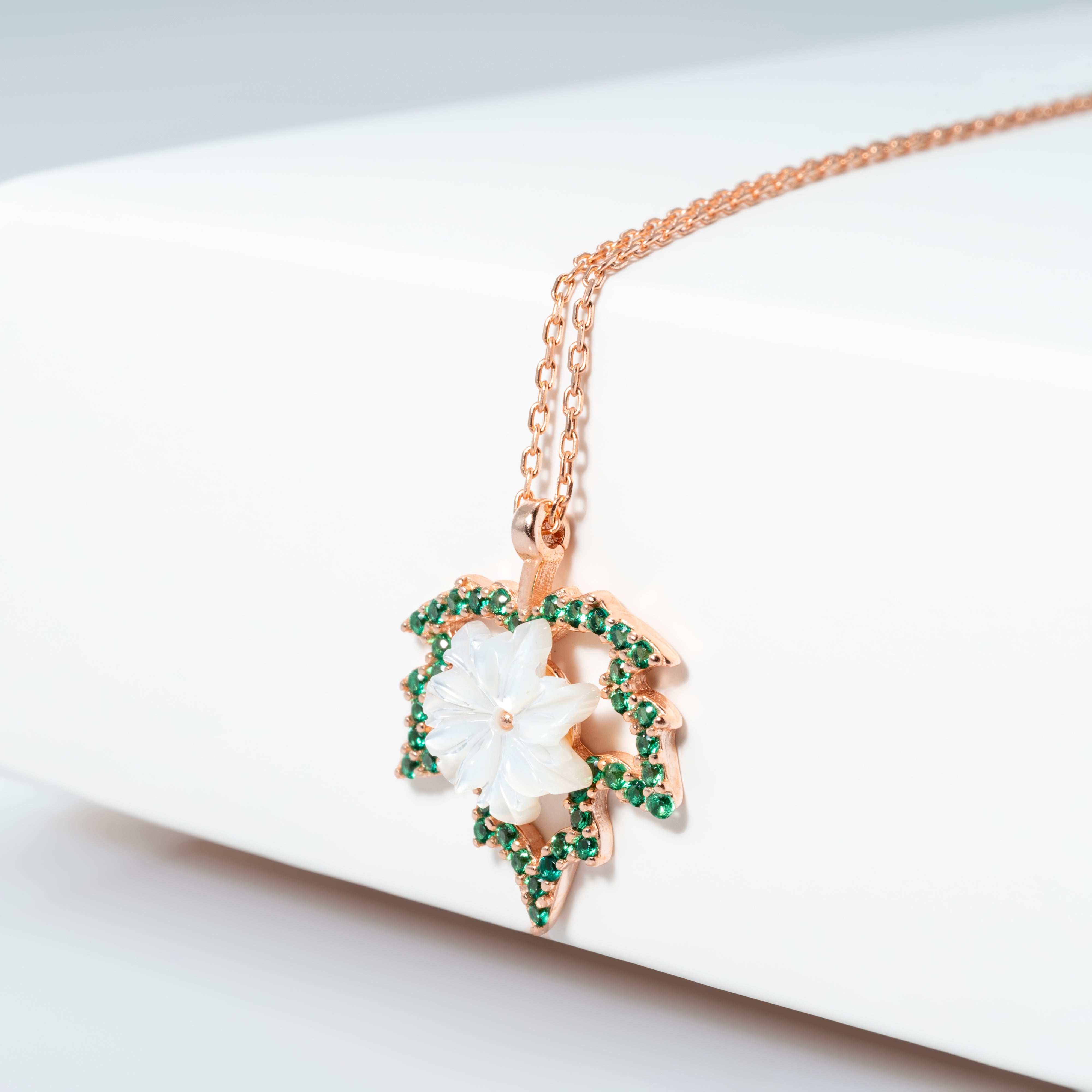 Deze elegante 925 zilveren ketting met rozekleurige details combineert de tijdloze schoonheid van het plataanblad en de magnoliabloem, verrijkt met een fonkelende synthetische smaragdsteen. De diepe groene tint van de smaragd straalt luxe en natuurlijke elegantie uit, terwijl de delicate bloemaccenten het ontwerp een romantische en verfijnde uitstraling geven. Dit sieraad is perfect voor zowel dagelijks gebruik als speciale gelegenheden.
