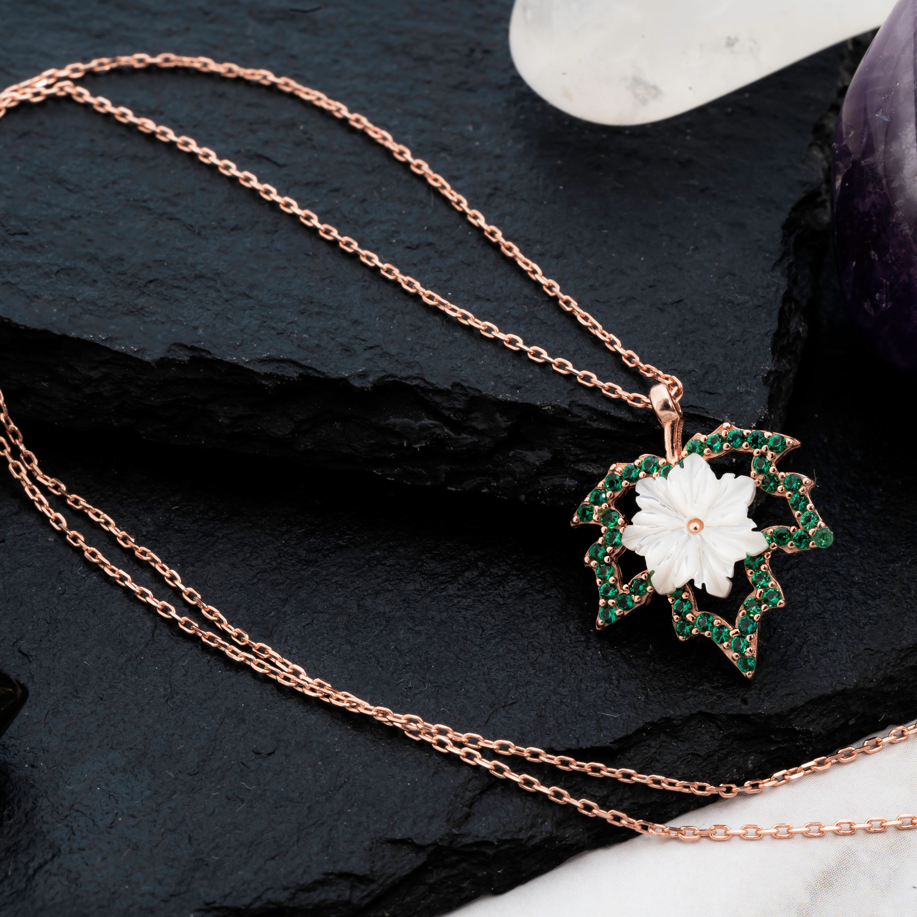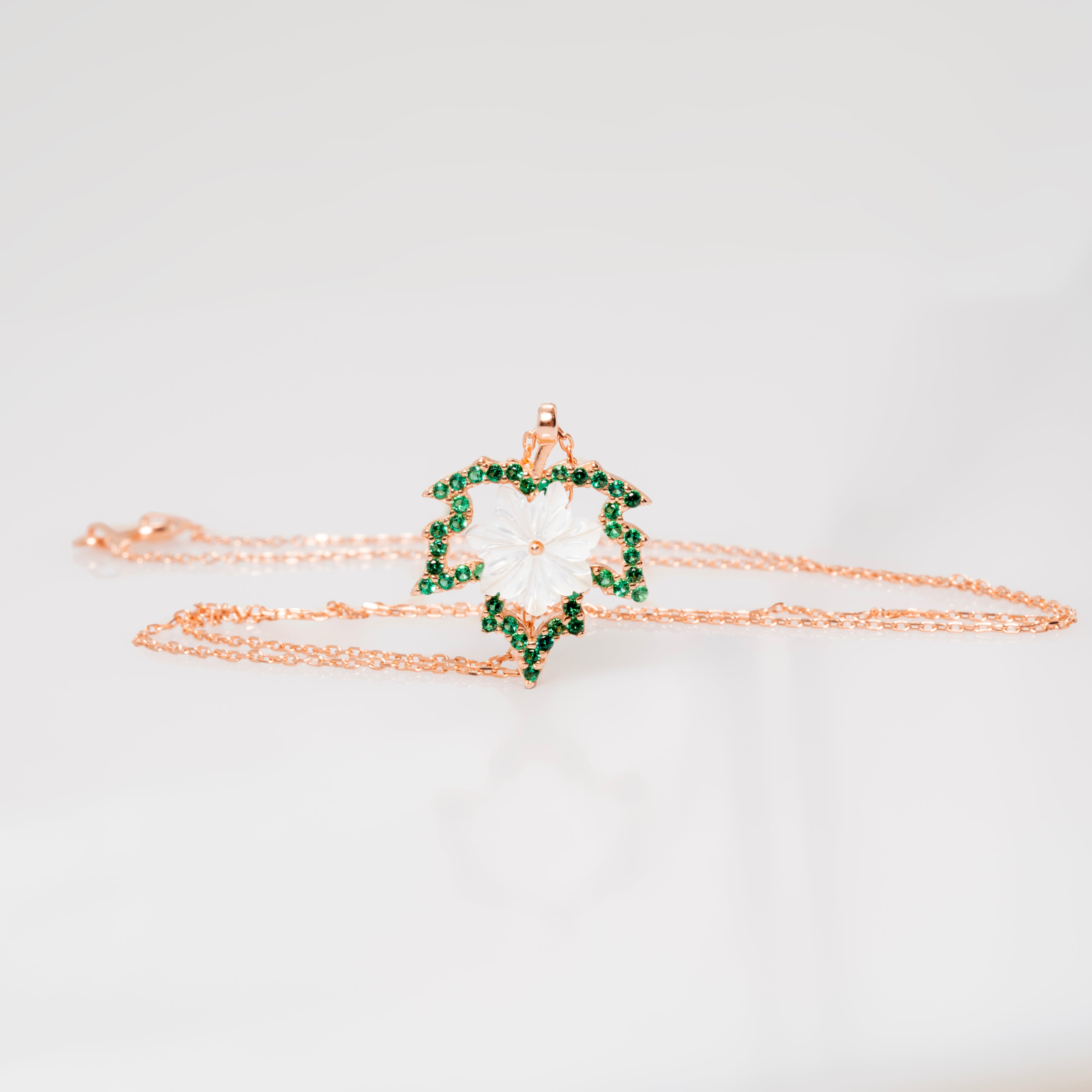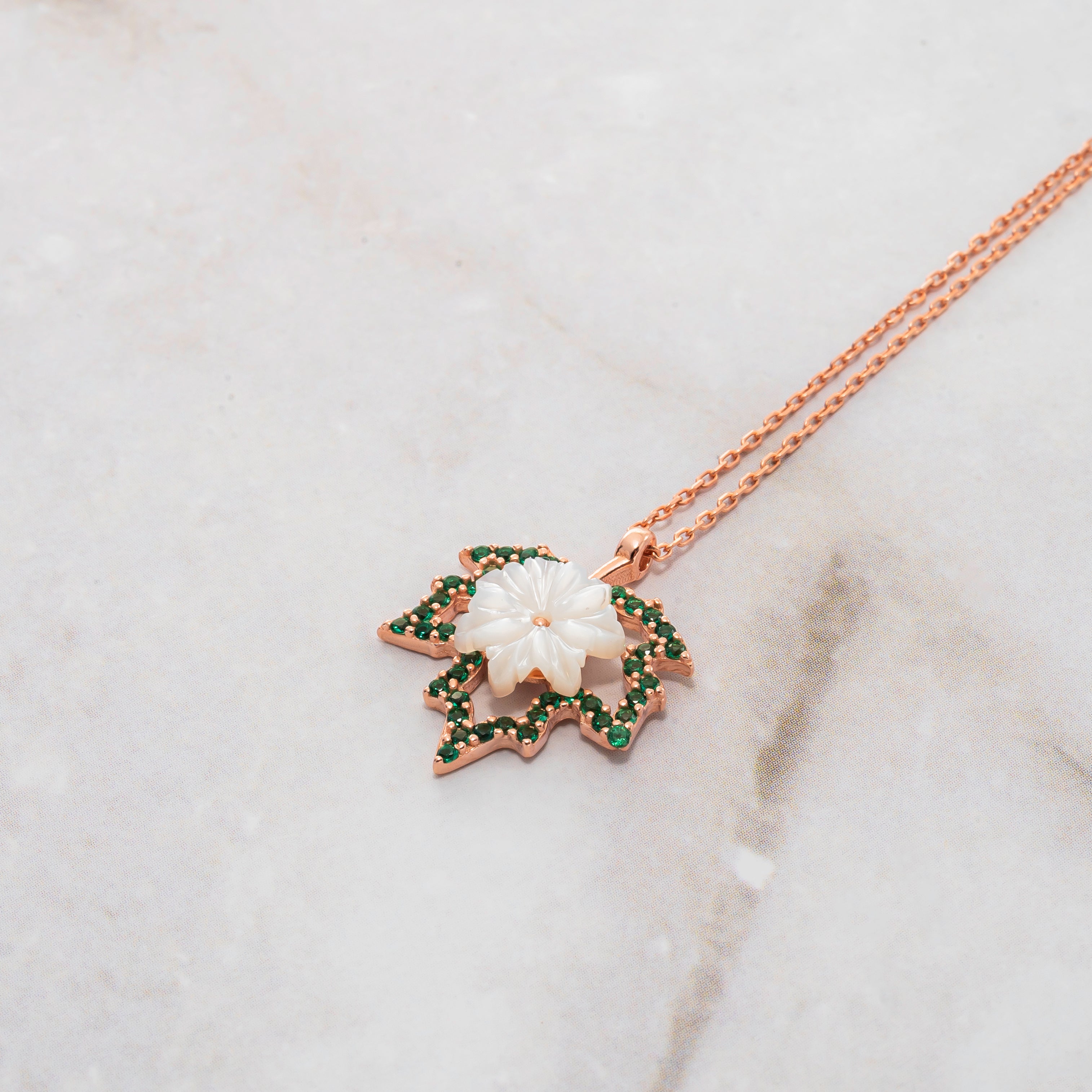 Deze elegante 925 zilveren ketting met rozekleurige details combineert de tijdloze schoonheid van het plataanblad en de magnoliabloem, verrijkt met een fonkelende synthetische smaragdsteen. De diepe groene tint van de smaragd straalt luxe en natuurlijke elegantie uit, terwijl de delicate bloemaccenten het ontwerp een romantische en verfijnde uitstraling geven. Dit sieraad is perfect voor zowel dagelijks gebruik als speciale gelegenheden.